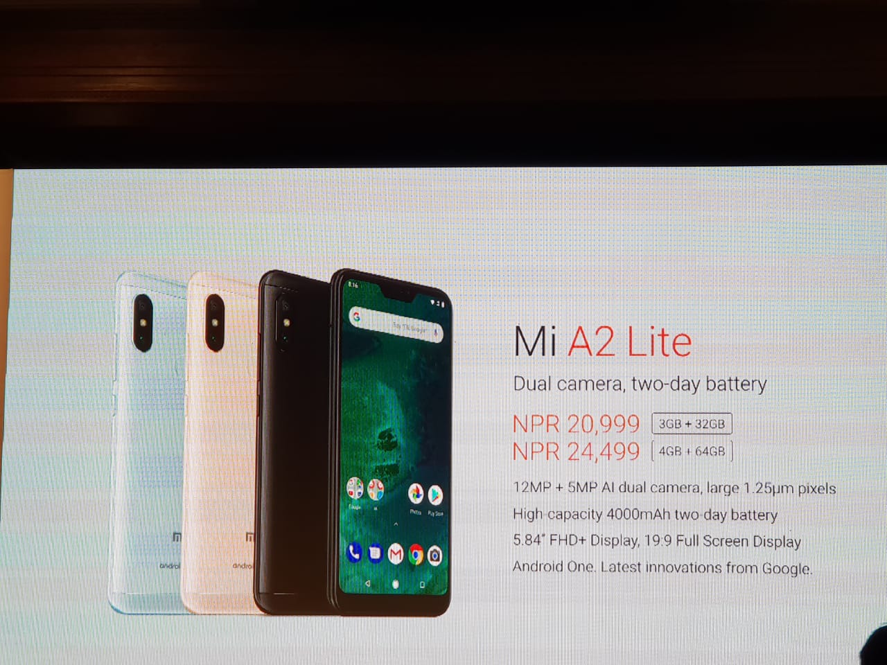 Mi A2 comes with 4GB of RAM and 64GB of ROM at a price of NPR 30, 999.